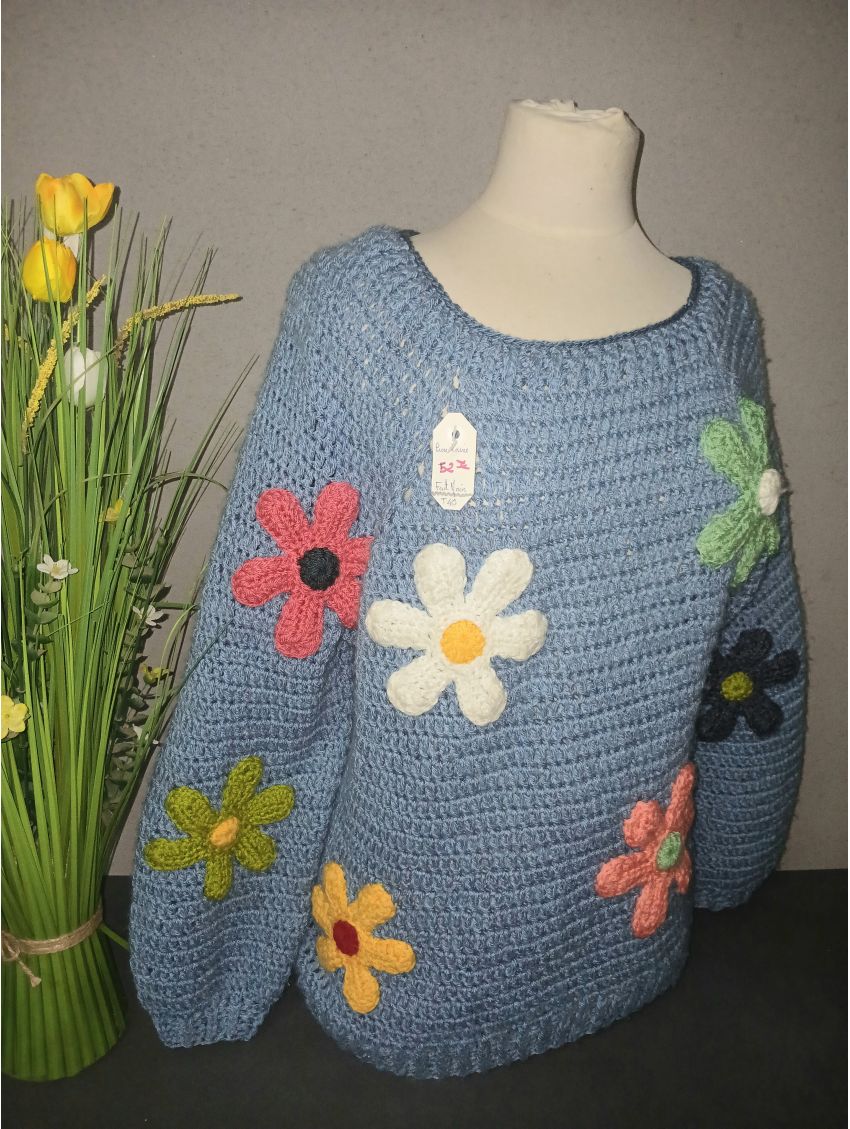 Joli pull fait au crochet, bleu, avec de belles fleurs