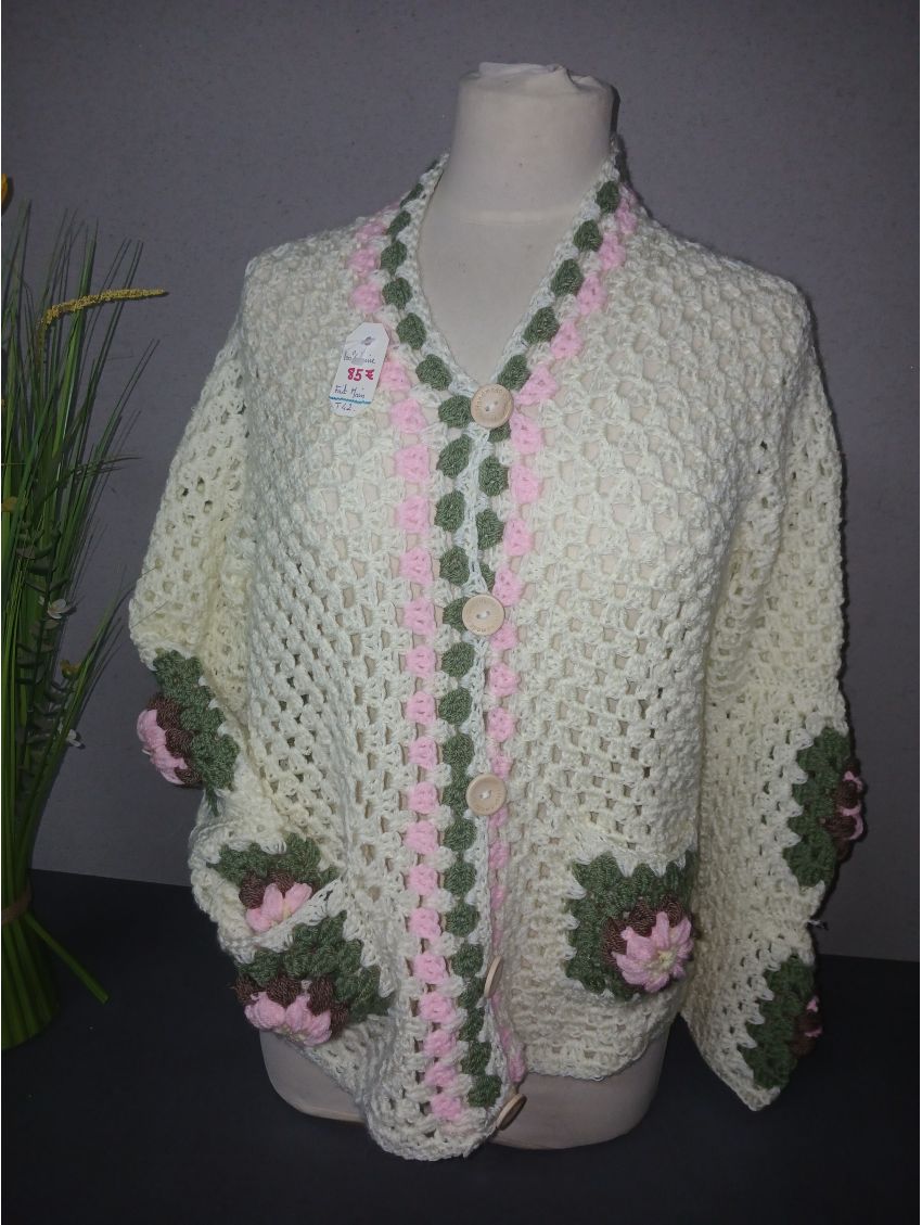 trés joli gilet au crochet,5 boutons, 2 poches avec fleurs, écru