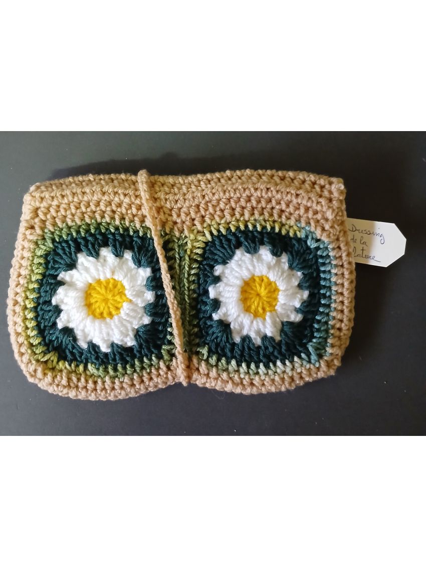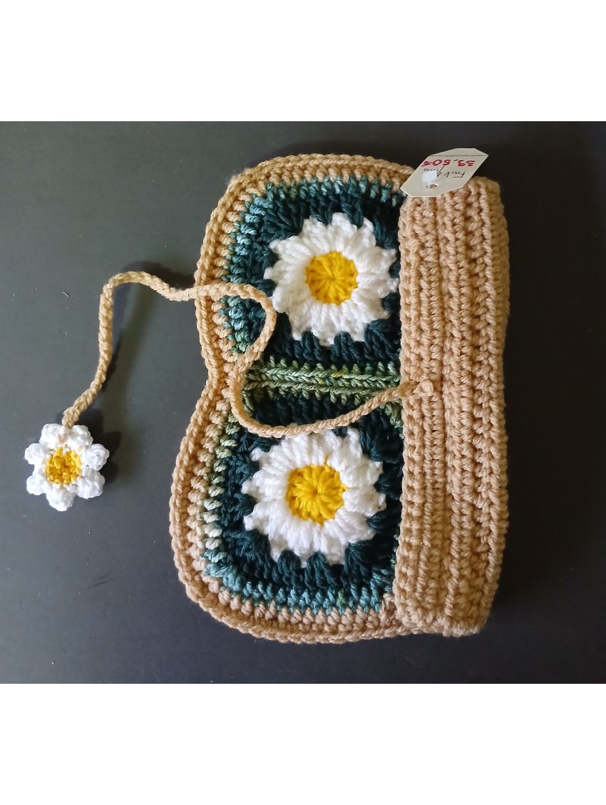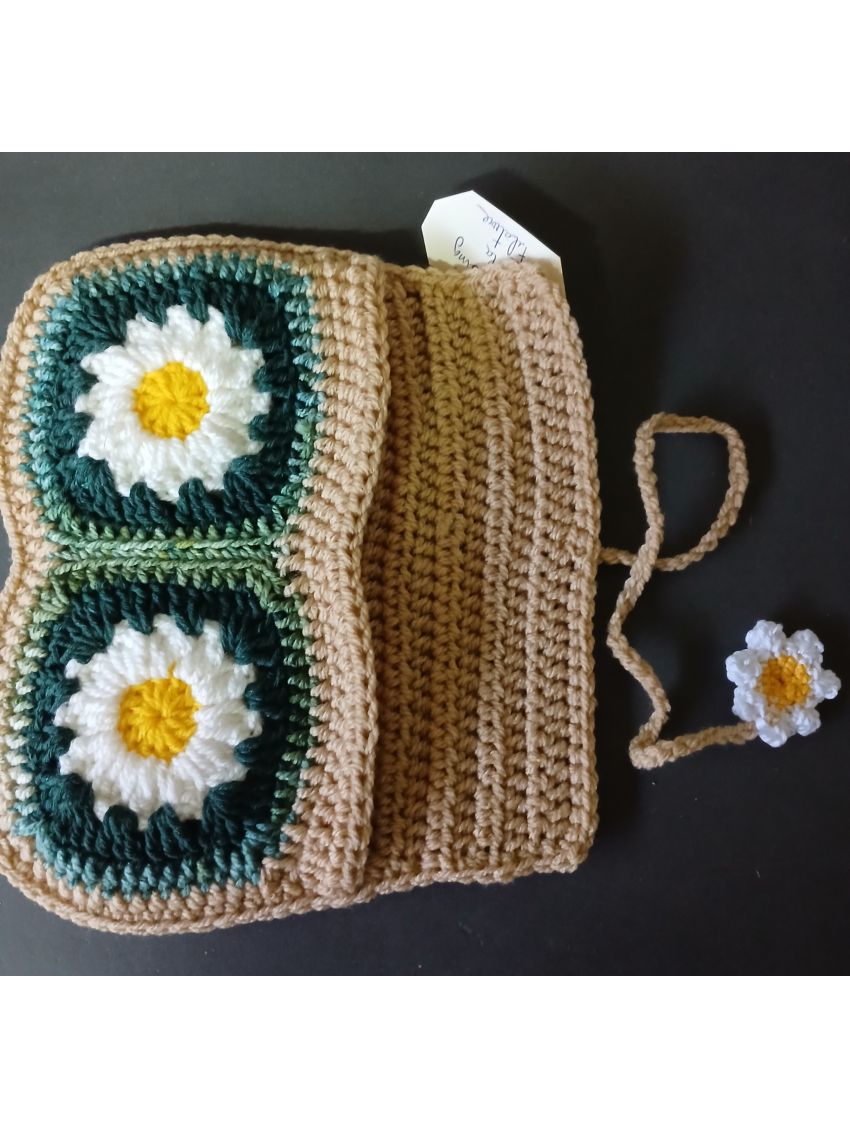 Pochette en crochet, marron vert fleurs blanches avec lien qui se termine par une fleur blanches